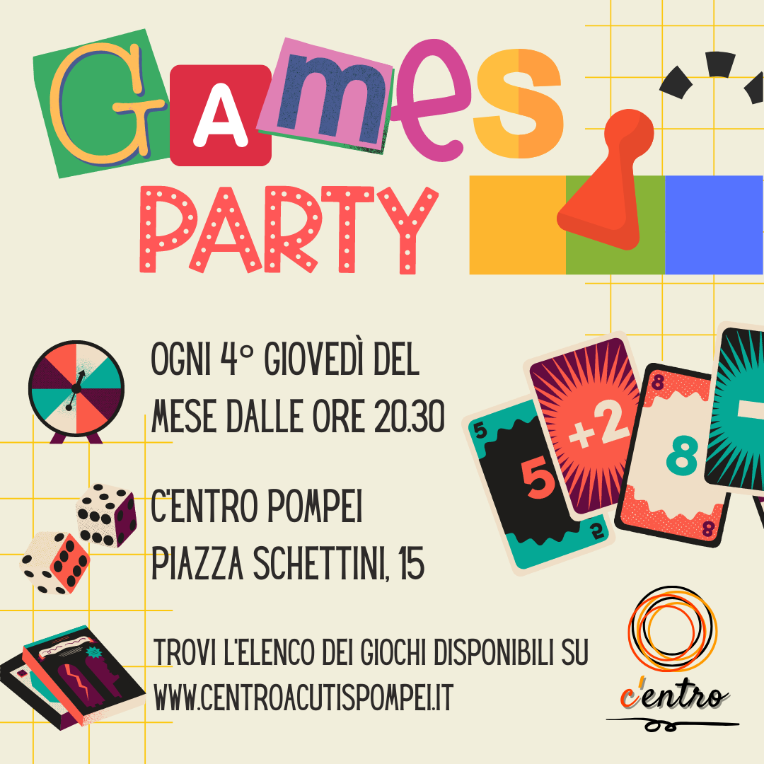 Nelle serate di Games party saranno messi a disposizione tutti i giochi presenti nella ludoteca del C’entro. Sono tantissimi e sempre in aggiornamento. I partecipanti possono decidere di giocare ad uno o a tutti i giochi proposti oppure possono semplicemente assistere ad una partita per capire come si gioca e poi dilettarsi nei giorni successivi perché la ludoteca del C’entro è sempre a disposizione.