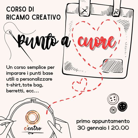 Arriva al C’entro un nuovo appuntamento: PUNTO A CUORE, corso di ricamo creativo. Durante i nostri incontri impareremo i punti base, le tecniche principali utili a personalizzare ciò che più ci piace (t-shirt, tote bag e molti altri oggetti)! Non è necessario saper cucire, inizieremo da zero e insieme riusciremo a creare cose meravigliose.